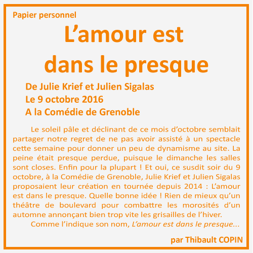 Alors oui, la formule initiale a quelque peu évoluée. Disons qu'elle s'est recentrée. Avec une ambition toute gardée pour l'avenir, le format du site s'est retranché sur un blog personnel, mais espère toujours se développer vers un système participatif ! Nous défendons ici la critique théâtrale comme un exercice d'écriture stylistique et toute personne est invitée à s'y amuser.